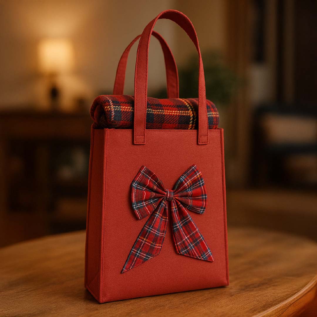Plaid Natalizio con Borsa in Pannolenci e Fiocco Tartan